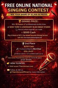 QUEENS VILLAGE, NY, UNITED STATES, March 17, 2026 /EINPresswire.com/ -- Titan Verses, an online music competition platform focused on emerging talent, has announced the launch of its national online singing competition, inviting vocalists across the United States to participate in a digital, community-driven tournament.As music discovery continues to evolve across digital platforms, independent artists face increasing challenges in gaining visibility and building engaged audiences. Titan Verses was developed to provide a structured online environment where singers, hip-hop artists, poets, and musicians can showcase their abilities while connecting with a broader creative community.